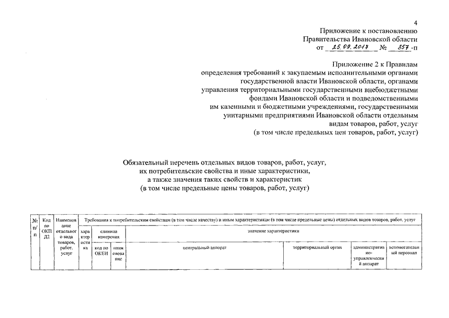 Постановление Правительства Ивановской области от 25.09.2017 N 357-п "О внесении изменений в постановление Правительства Ивановской области от 27.05.2016 N 144-п "Об утверждении Правил определения требований к закупаемым исполнительными органами государственной власти Ивановской области, органами управления территориальными государственными внебюджетными фондами Ивановской области и подведомственными им казенными и бюджетными учреждениями отдельным видам товаров, работ, услуг (в том числе предельных цен товаров, работ, услуг)" (вместе с "Обязательным перечнем отдельных видов товаров, работ, услуг, их потребительскими свойствами и иными характеристиками, а также значениями таких свойств и характеристик (в том числе предельные цены товаров, работ, услуг)")
