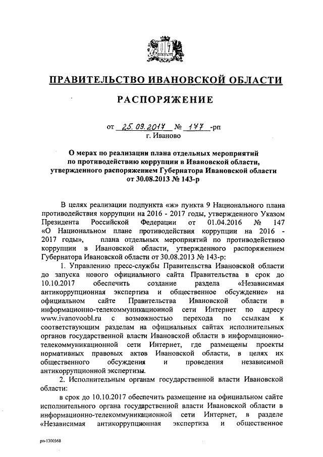 Распоряжение Правительства Ивановской области от 25.09.2017 N 177-рп "О мерах по реализации плана отдельных мероприятий по противодействию коррупции в Ивановской области, утвержденного распоряжением Губернатора Ивановской области от 30.08.2013 N 143-р"