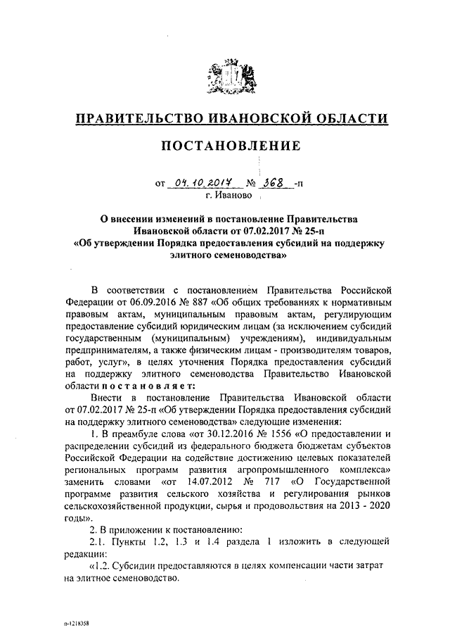 Постановление Правительства Ивановской области от 04.10.2017 N 368-п "О внесении изменений в постановление Правительства Ивановской области от 07.02.2017 N 25-п "Об утверждении Порядка предоставления субсидий на поддержку элитного семеноводства"