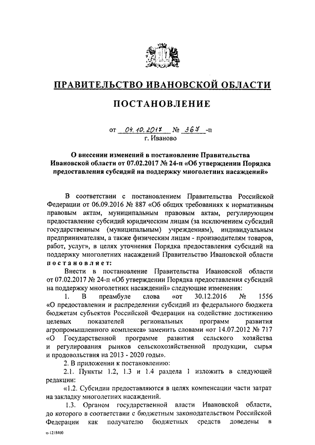 Постановление Правительства Ивановской области от 04.10.2017 N 367-п "О внесении изменений в постановление Правительства Ивановской области от 07.02.2017 N 24-п "Об утверждении Порядка предоставления субсидий на поддержку многолетних насаждений"