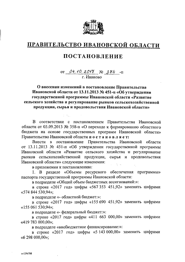 Постановление Правительства Ивановской области от 04.10.2017 N 374-п "О внесении изменений в постановление Правительства Ивановской области от 13.11.2013 N 451-п "Об утверждении государственной программы Ивановской области "Развитие сельского хозяйства и регулирование рынков сельскохозяйственной продукции, сырья и продовольствия Ивановской области"