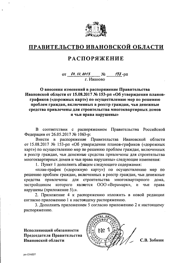 Распоряжение Правительства Ивановской области от 04.10.2017 N 178-рп "О внесении изменений в распоряжение Правительства Ивановской области от 15.08.2017 N 153-рп "Об утверждении планов-графиков ("дорожных карт") по осуществлению мер по решению проблем граждан, включенных в реестр граждан, чьи денежные средства привлечены для строительства многоквартирных домов и чьи права нарушены" (вместе с "Планом-графиком ("дорожной картой") по осуществлению мер по решению проблем граждан, включенных в реестр граждан, чьи денежные средства привлечены для строительства многоквартирных домов, застройщиком которых является ОАО "ДСК", и чьи права нарушены", "Планом-графиком ("дорожной картой") по осуществлению мер по решению проблем граждан, включенных в реестр граждан, чьи денежные средства привлечены для строительства многоквартирного дома, застройщиком которого является ООО "Верамарк", и чьи права нарушены")