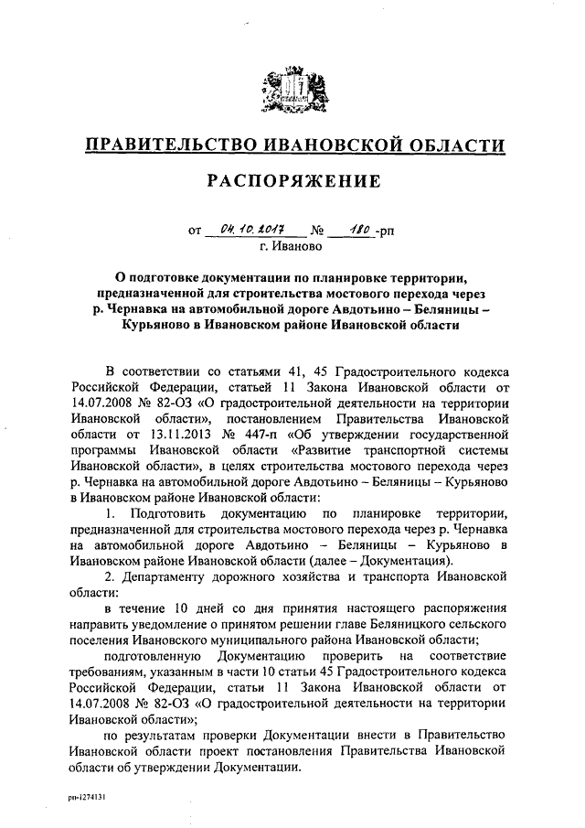 Распоряжение Правительства Ивановской области от 04.10.2017 N 180-рп "О подготовке документации по планировке территории, предназначенной для строительства мостового перехода через р. Чернавка на автомобильной дороге Авдотьино - Беляницы - Курьяново в Ивановском районе Ивановской области"