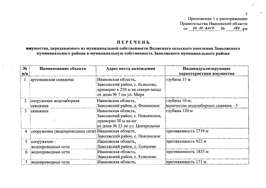 Распоряжение Правительства Ивановской области от 04.10.2017 N 182-рп "О разграничении имущества, находящегося в муниципальной собственности, между Заволжским муниципальным районом и сельскими поселениями, входящими в его состав, в связи с изменением перечня вопросов местного значения сельского поселения"