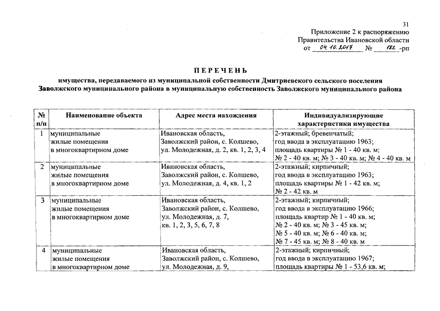 Распоряжение Правительства Ивановской области от 04.10.2017 N 182-рп "О разграничении имущества, находящегося в муниципальной собственности, между Заволжским муниципальным районом и сельскими поселениями, входящими в его состав, в связи с изменением перечня вопросов местного значения сельского поселения"