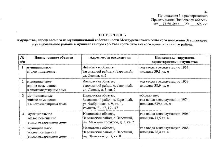 Распоряжение Правительства Ивановской области от 04.10.2017 N 182-рп "О разграничении имущества, находящегося в муниципальной собственности, между Заволжским муниципальным районом и сельскими поселениями, входящими в его состав, в связи с изменением перечня вопросов местного значения сельского поселения"
