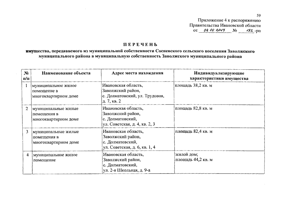Распоряжение Правительства Ивановской области от 04.10.2017 N 182-рп "О разграничении имущества, находящегося в муниципальной собственности, между Заволжским муниципальным районом и сельскими поселениями, входящими в его состав, в связи с изменением перечня вопросов местного значения сельского поселения"