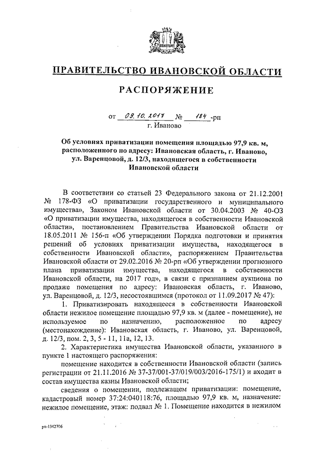 Распоряжение Правительства Ивановской области от 09.10.2017 N 184-рп "Об условиях приватизации помещения площадью 97,9 кв. м, расположенного по адресу: Ивановская область, г. Иваново, ул. Варенцовой, д. 12/3, находящегося в собственности Ивановской области"