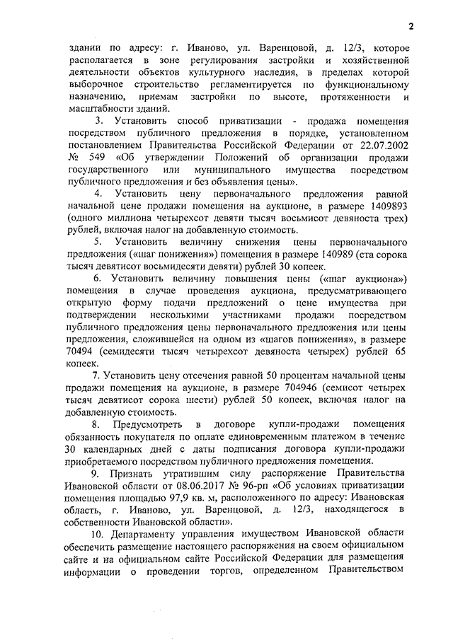 Распоряжение Правительства Ивановской области от 09.10.2017 N 184-рп "Об условиях приватизации помещения площадью 97,9 кв. м, расположенного по адресу: Ивановская область, г. Иваново, ул. Варенцовой, д. 12/3, находящегося в собственности Ивановской области"