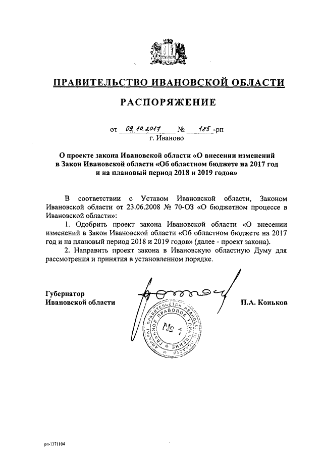 Распоряжение Правительства Ивановской области от 09.10.2017 N 185-рп "О проекте закона Ивановской области "О внесении изменений в Закон Ивановской области "Об областном бюджете на 2017 год и на плановый период 2018 и 2019 годов"