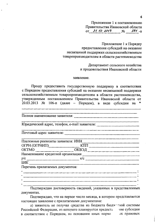 Постановление Правительства Ивановской области от 31.10.2017 N 391-п "О внесении изменений в постановление Правительства Ивановской области от 20.03.2013 N 106-п "Об утверждении Порядка предоставления субсидий на оказание несвязанной поддержки сельскохозяйственным товаропроизводителям в области растениеводства"
