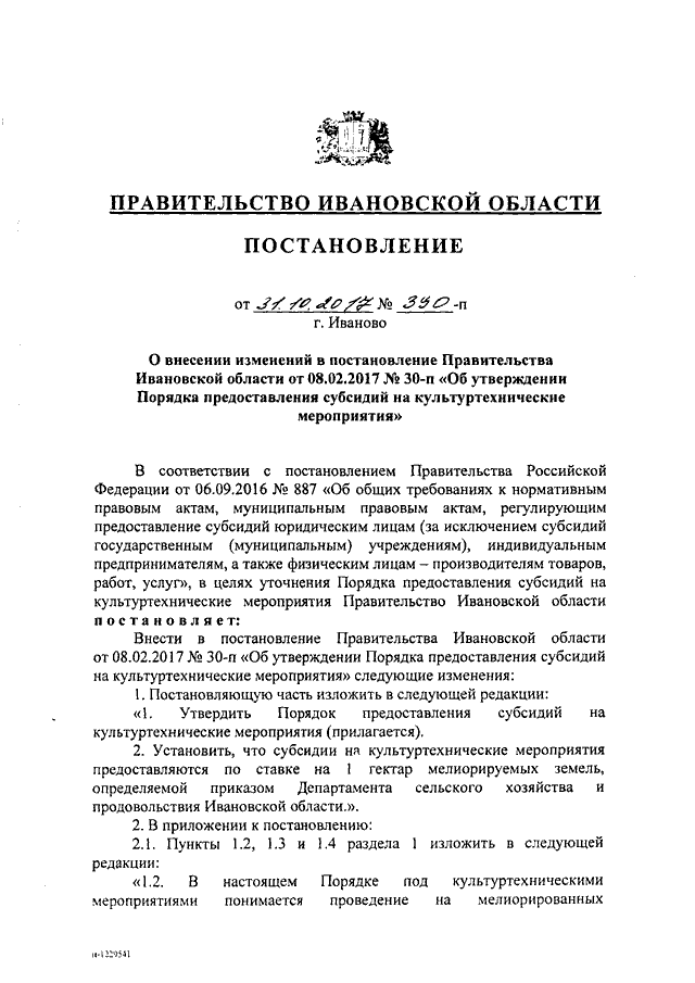 Постановление Правительства Ивановской области от 31.10.2017 N 390-п "О внесении изменений в постановление Правительства Ивановской области от 08.02.2017 N 30-п "Об утверждении Порядка предоставления субсидий на культуртехнические мероприятия"