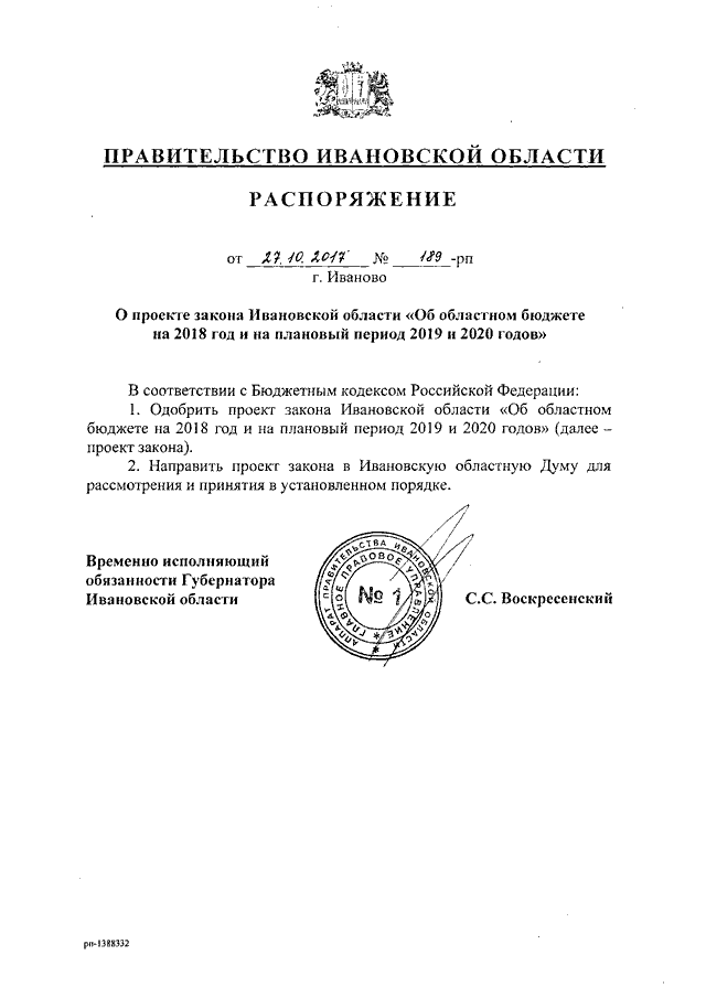 Распоряжение Правительства Ивановской области от 27.10.2017 N 189-рп "О проекте закона Ивановской области "Об областном бюджете на 2018 год и на плановый период 2019 и 2020 годов"