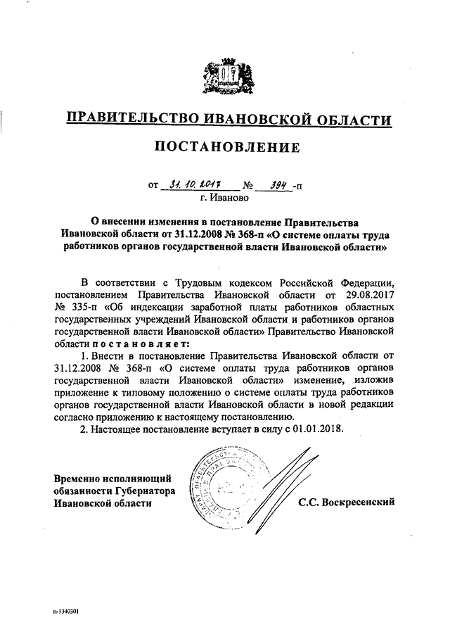 Постановление Правительства Ивановской области от 31.10.2017 N 394-п "О внесении изменения в постановление Правительства Ивановской области от 31.12.2008 N 368-п "О системе оплаты труда работников органов государственной власти Ивановской области"