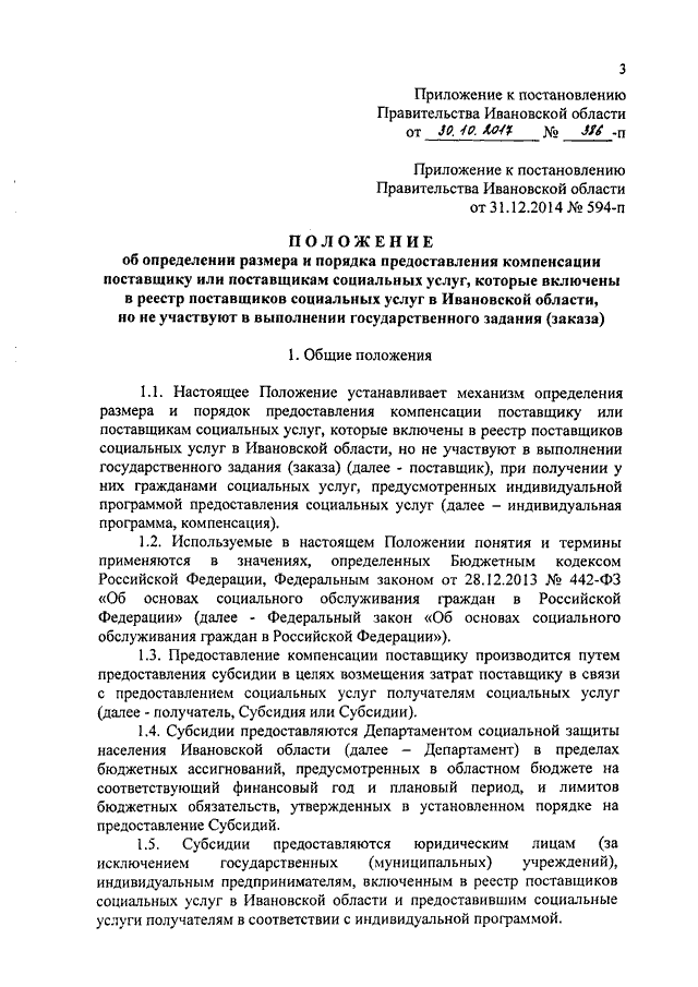 Постановление Правительства Ивановской области от 30.10.2017 N 386-п "О внесении изменения в постановление Правительства Ивановской области от 31.12.2014 N 594-п "Об утверждении Положения об определении размера и порядка предоставления компенсации поставщику или поставщикам социальных услуг, которые включены в реестр поставщиков социальных услуг в Ивановской области, но не участвуют в выполнении государственного задания (заказа)"