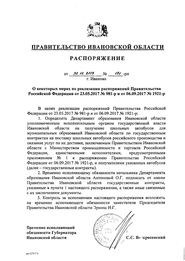Распоряжение Правительства Ивановской области от 30.10.2017 N 191-рп "О некоторых мерах по реализации распоряжений Правительства Российской Федерации от 23.05.2017 N 981-р и от 06.09.2017 N 1921-р"