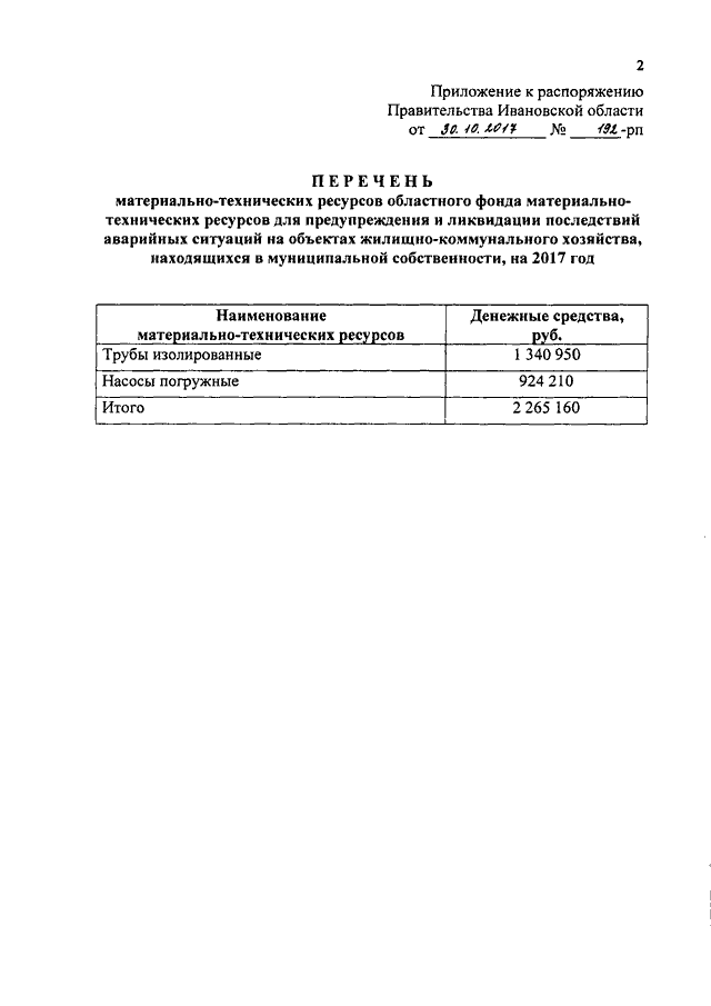 Распоряжение Правительства Ивановской области от 30.10.2017 N 192-рп "Об утверждении перечня материально-технических ресурсов областного фонда материально-технических ресурсов для предупреждения и ликвидации последствий аварийных ситуаций на объектах жилищно-коммунального хозяйства, находящихся в муниципальной собственности, на 2017 год"