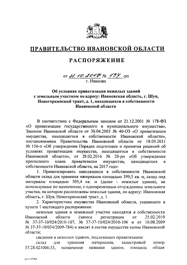 Распоряжение Правительства Ивановской области от 31.10.2017 N 194-рп "Об условиях приватизации нежилых зданий с земельным участком по адресу: Ивановская область, г. Шуя, Новогоркинский тракт, д. 1, находящихся в собственности Ивановской области"
