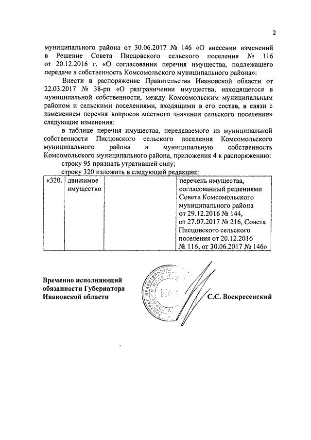 Распоряжение Правительства Ивановской области от 31.10.2017 N 196-рп "О внесении изменений в распоряжение Правительства Ивановской области от 22.03.2017 N 38-рп "О разграничении имущества, находящегося в муниципальной собственности, между Комсомольским муниципальным районом и сельскими поселениями, входящими в его состав, в связи с изменением перечня вопросов местного значения сельского поселения"