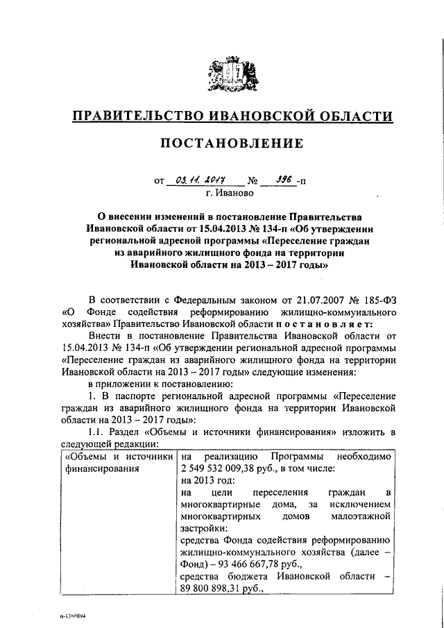 Постановление Правительства Ивановской области от 03.11.2017 N 396-п "О внесении изменений в постановление Правительства Ивановской области от 15.04.2013 N 134-п "Об утверждении региональной адресной программы "Переселение граждан из аварийного жилищного фонда на территории Ивановской области на 2013 - 2017 годы" (вместе с "Перечнем аварийных многоквартирных домов, из которых граждане подлежат переселению в многоквартирные дома, за исключением многоквартирных домов малоэтажной застройки", "Перечнем аварийных многоквартирных домов, из которых граждане подлежат переселению в многоквартирные дома, отнесенные к домам малоэтажной застройки", "Реестром аварийных многоквартирных домов по способам переселения, из которых граждане подлежат переселению в многоквартирные дома, за исключением многоквартирных домов малоэтажной застройки", "Реестром аварийных многоквартирных домов по способам переселения, из которых граждане подлежат переселению в многоквартирные дома, отнесенные к домам малоэтажной застройки")