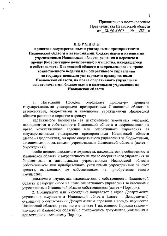 Постановление Правительства Ивановской области от 02.11.2017 N 395-п "Об утверждении Порядка принятия государственными унитарными предприятиями Ивановской области и автономными, бюджетными и казенными учреждениями Ивановской области решения о передаче в аренду (безвозмездное пользование) имущества, находящегося в собственности Ивановской области и закрепленного на праве хозяйственного ведения или оперативного управления за государственными унитарными предприятиями Ивановской области, на праве оперативного управления за автономными, бюджетными и казенными учреждениями Ивановской области, и о внесении изменений в некоторые постановления Правительства Ивановской области"