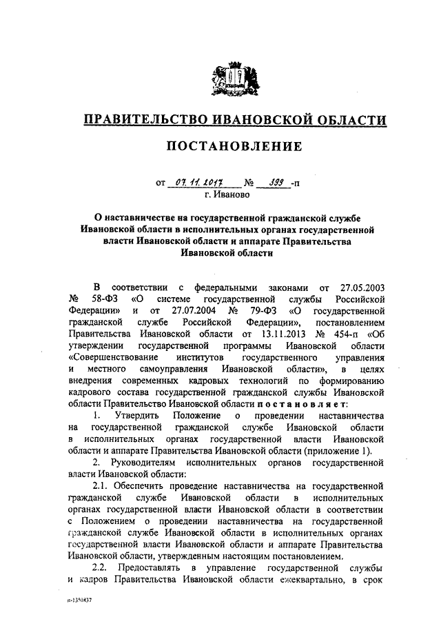 Постановление Правительства Ивановской области от 07.11.2017 N 399-п "О наставничестве на государственной гражданской службе Ивановской области в исполнительных органах государственной власти Ивановской области и аппарате Правительства Ивановской области" (вместе с "Положением о проведении наставничества на государственной гражданской службе Ивановской области в исполнительных органах государственной власти Ивановской области и аппарате Правительства Ивановской области")