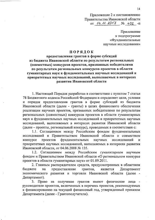 Постановление Правительства Ивановской области от 14.11.2017 N 402-п "О внесении изменений в постановление Правительства Ивановской области от 13.11.2013 N 459-п "Об утверждении государственной программы Ивановской области "Экономическое развитие и инновационная экономика Ивановской области" (вместе с "Порядком предоставления грантов в форме субсидий из бюджета Ивановской области по результатам региональных (совместных) конкурсов проектов, признанных победителями по результатам региональных конкурсов проектов в области гуманитарных наук и фундаментальных научных исследований и приоритетных научных исследований, выполняемых в интересах развития Ивановской области")
