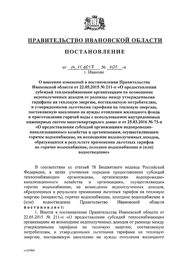 Постановление Правительства Ивановской области от 14.11.2017 N 401-п "О внесении изменений в постановления Правительства Ивановской области от 22.05.2015 N 211-п "О предоставлении субсидий теплоснабжающим организациям на возмещение недополученных доходов от разницы между утвержденными тарифами на тепловую энергию, поставляемую потребителям, и утвержденными льготными тарифами на тепловую энергию, поставляемую населению на нужды отопления жилищного фонда и приготовления горячей воды с использованием внутридомовых инженерных систем многоквартирного дома" и от 25.03.2016 N 73-п "О предоставлении субсидий организациям водопроводно-канализационного хозяйства и организациям, осуществляющим горячее водоснабжение, на возмещение недополученных доходов, образующихся в результате применения льготных тарифов на горячее водоснабжение, холодное водоснабжение и (или) водоотведение"