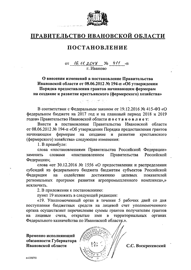 Постановление Правительства Ивановской области от 16.11.2017 N 411-п "О внесении изменений в постановление Правительства Ивановской области от 08.06.2012 N 194-п "Об утверждении Порядка предоставления грантов начинающим фермерам на создание и развитие крестьянского (фермерского) хозяйства"