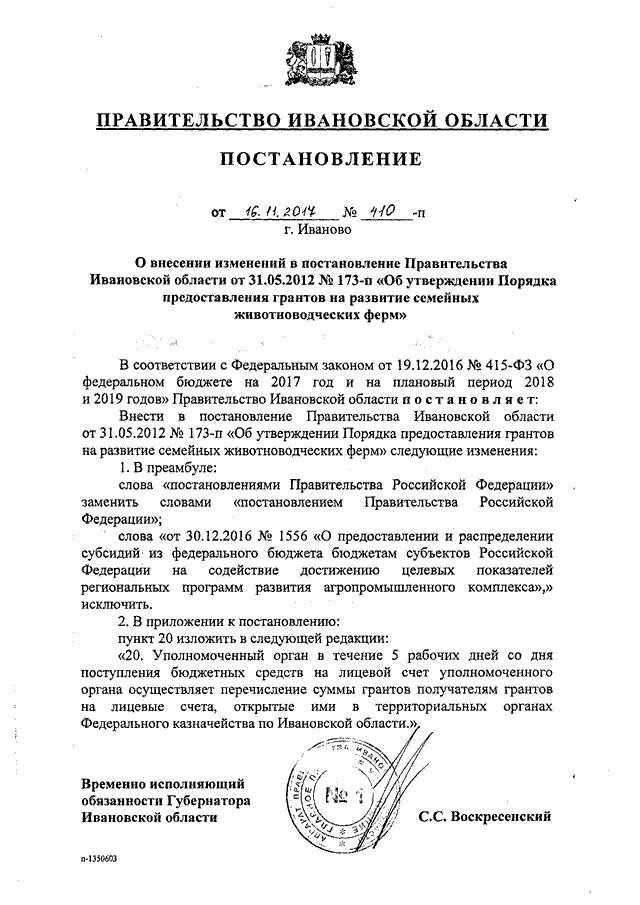 Постановление Правительства Ивановской области от 16.11.2017 N 410-п "О внесении изменений в постановление Правительства Ивановской области от 31.05.2012 N 173-п "Об утверждении Порядка предоставления грантов на развитие семейных животноводческих ферм"
