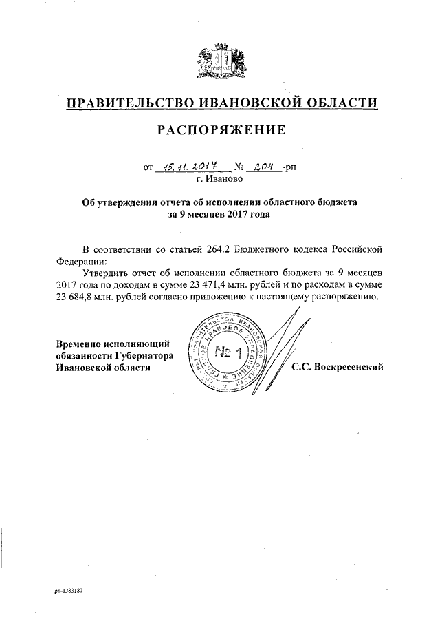 Распоряжение Правительства Ивановской области от 15.11.2017 N 204-рп "Об утверждении отчета об исполнении областного бюджета за 9 месяцев 2017 года"