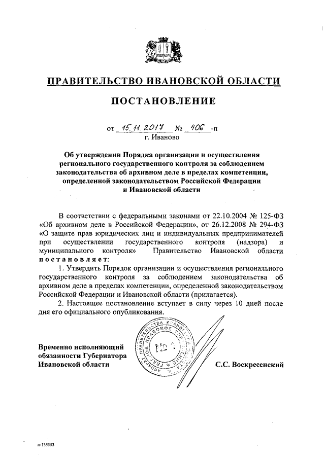 Постановление Правительства Ивановской области от 15.11.2017 N 406-п "Об утверждении Порядка организации и осуществления регионального государственного контроля за соблюдением законодательства об архивном деле в пределах компетенции, определенной законодательством Российской Федерации и Ивановской области"