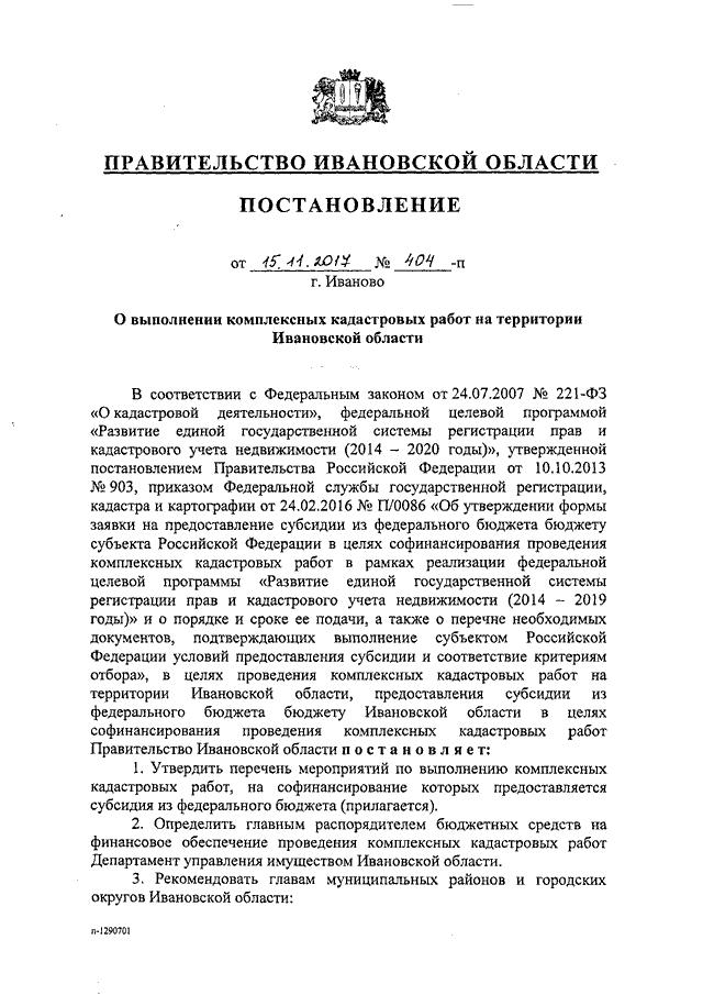Постановление Правительства Ивановской области от 15.11.2017 N 404-п "О выполнении комплексных кадастровых работ на территории Ивановской области" (вместе с "Перечнем мероприятий по выполнению комплексных кадастровых работ, на софинансирование которых предоставляется субсидия из федерального бюджета")