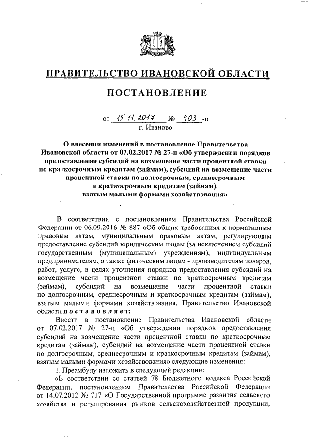 Постановление Правительства Ивановской области от 15.11.2017 N 403-п "О внесении изменений в постановление Правительства Ивановской области от 07.02.2017 N 27-п "Об утверждении порядков предоставления субсидий на возмещение части процентной ставки по краткосрочным кредитам (займам), субсидий на возмещение части процентной ставки по долгосрочным, среднесрочным и краткосрочным кредитам (займам), взятым малыми формами хозяйствования"