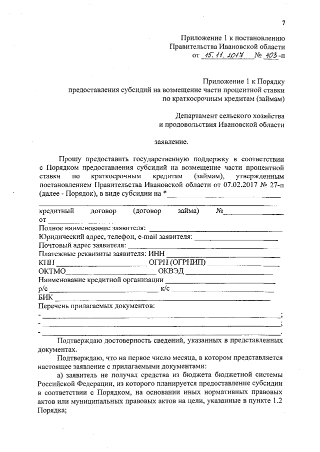 Постановление Правительства Ивановской области от 15.11.2017 N 403-п "О внесении изменений в постановление Правительства Ивановской области от 07.02.2017 N 27-п "Об утверждении порядков предоставления субсидий на возмещение части процентной ставки по краткосрочным кредитам (займам), субсидий на возмещение части процентной ставки по долгосрочным, среднесрочным и краткосрочным кредитам (займам), взятым малыми формами хозяйствования"