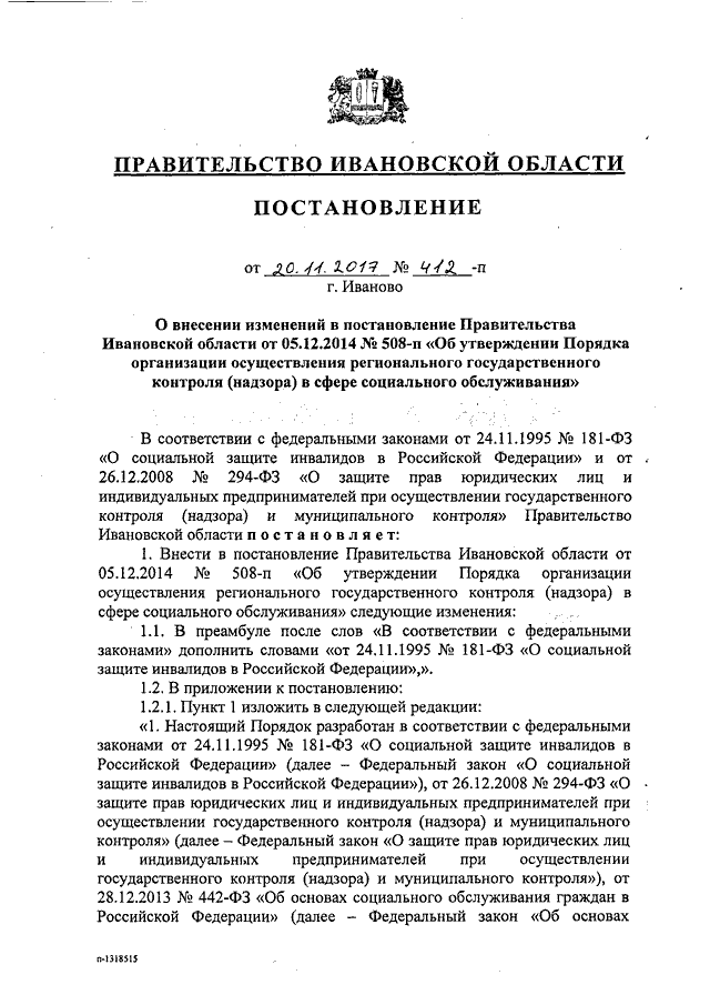 Постановление Правительства Ивановской области от 20.11.2017 N 412-п "О внесении изменений в постановление Правительства Ивановской области от 05.12.2014 N 508-п "Об утверждении Порядка организации осуществления регионального государственного контроля (надзора) в сфере социального обслуживания"