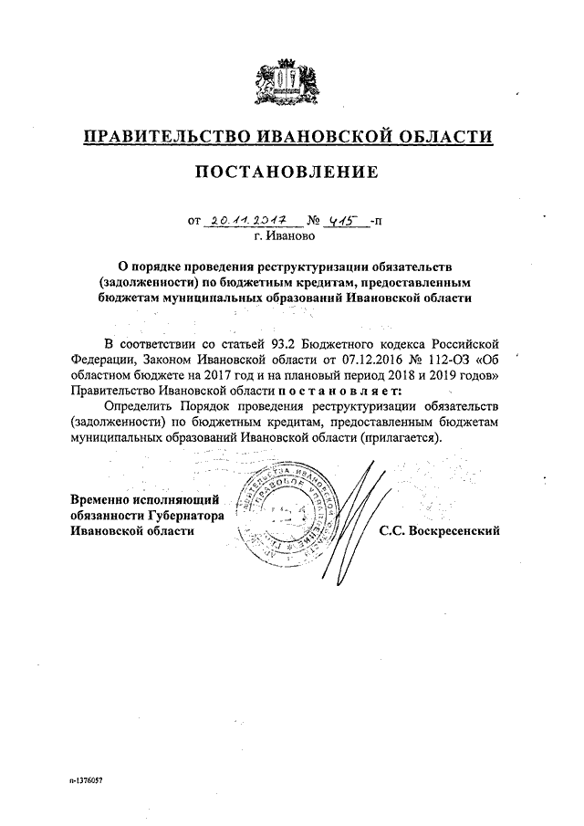 Постановление Правительства Ивановской области от 20.11.2017 N 415-п "О Порядке проведения реструктуризации обязательств (задолженности) по бюджетным кредитам, предоставленным бюджетам муниципальных образований Ивановской области"