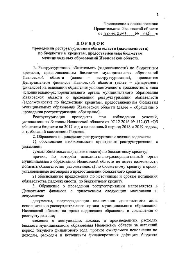 Постановление Правительства Ивановской области от 20.11.2017 N 415-п "О Порядке проведения реструктуризации обязательств (задолженности) по бюджетным кредитам, предоставленным бюджетам муниципальных образований Ивановской области"