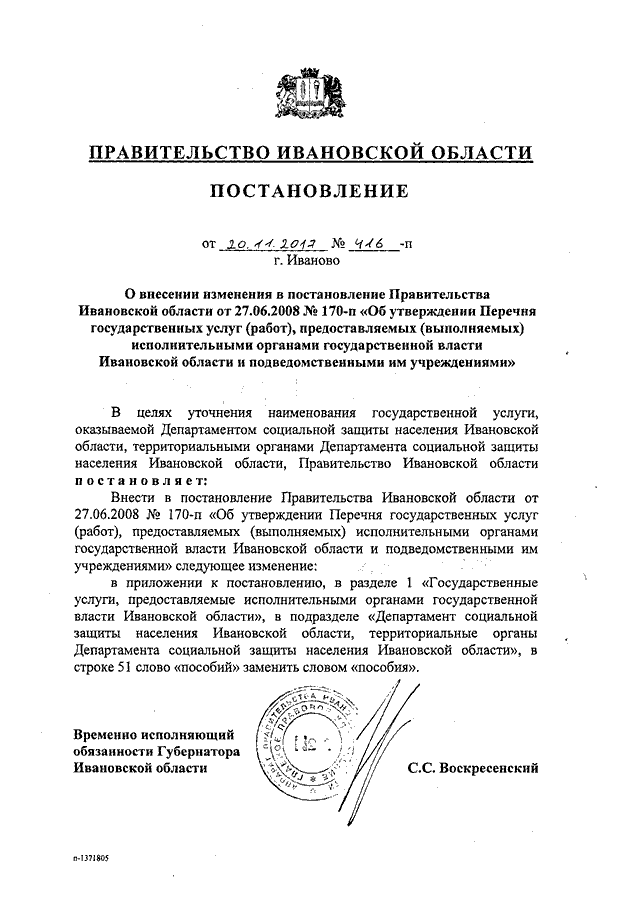 Постановление Правительства Ивановской области от 20.11.2017 N 416-п "О внесении изменения в постановление Правительства Ивановской области от 27.06.2008 N 170-п "Об утверждении Перечня государственных услуг (работ), предоставляемых (выполняемых) исполнительными органами государственной власти Ивановской области и подведомственными им учреждениями"