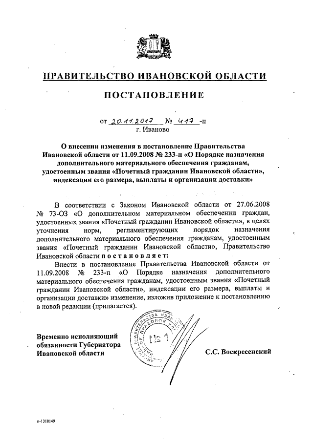 Постановление Правительства Ивановской области от 20.11.2017 N 417-п "О внесении изменения в постановление Правительства Ивановской области от 11.09.2008 N 233-п "О Порядке назначения дополнительного материального обеспечения гражданам, удостоенным звания "Почетный гражданин Ивановской области", индексации его размера, выплаты и организации доставки"