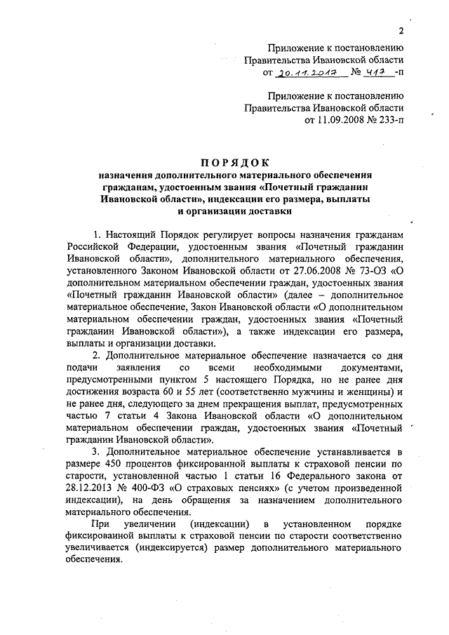 Постановление Правительства Ивановской области от 20.11.2017 N 417-п "О внесении изменения в постановление Правительства Ивановской области от 11.09.2008 N 233-п "О Порядке назначения дополнительного материального обеспечения гражданам, удостоенным звания "Почетный гражданин Ивановской области", индексации его размера, выплаты и организации доставки"