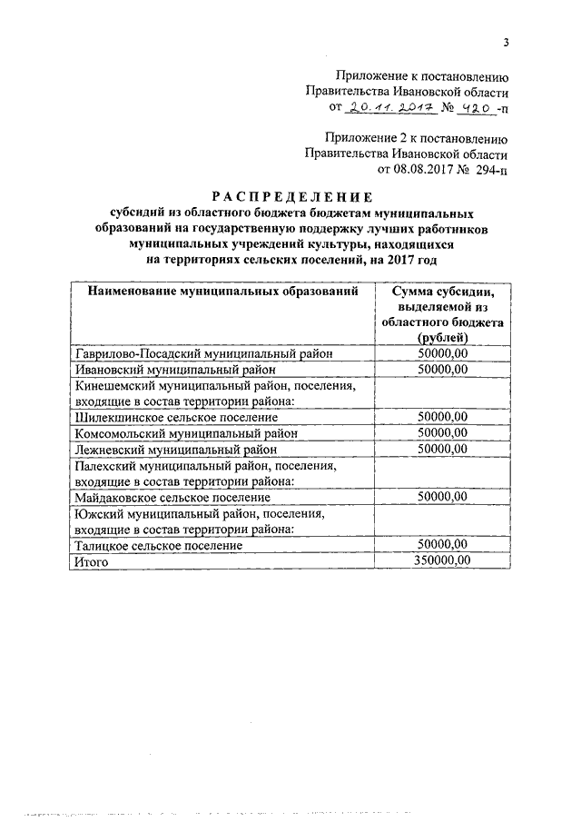 Постановление Правительства Ивановской области от 20.11.2017 N 420-п "О внесении изменения в постановление Правительства Ивановской области от 08.08.2017 N 294-п "О распределении субсидий из областного бюджета бюджетам муниципальных образований на государственную поддержку муниципальных учреждений культуры, государственную поддержку лучших работников муниципальных учреждений культуры, находящихся на территории сельских поселений, подключение общедоступных библиотек к сети Интернет и развитие библиотечного дела с учетом задачи расширения информационных технологий и оцифровки на 2017 год"