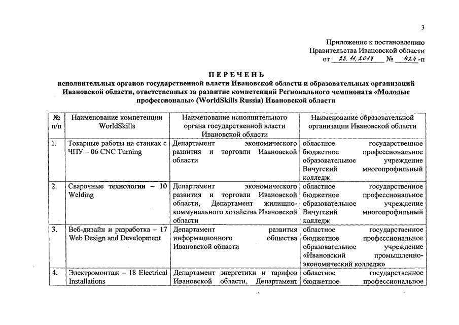 Постановление Правительства Ивановской области от 23.11.2017 N 424-п "Об определении исполнительных органов государственной власти Ивановской области и образовательных организаций Ивановской области, ответственных за развитие компетенций Регионального чемпионата "Молодые профессионалы" (WorldSkills Russia) Ивановской области" (вместе с "Перечнем исполнительных органов государственной власти Ивановской области и образовательных организаций Ивановской области, ответственных за развитие компетенций Регионального чемпионата "Молодые профессионалы" (WorldSkills Russia) Ивановской области")