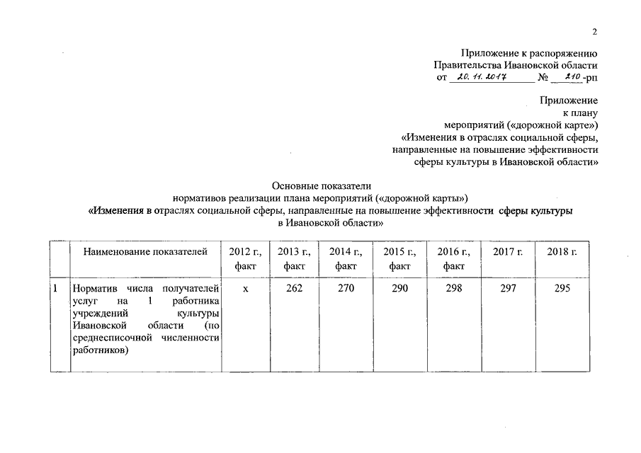 Распоряжение Правительства Ивановской области от 20.11.2017 N 210-рп "О внесении изменений в распоряжение Правительства Ивановской области от 26.02.2013 N 32-рп "Об утверждении плана мероприятий ("дорожной карты") "Изменения в отраслях социальной сферы, направленные на повышение эффективности сферы культуры в Ивановской области"