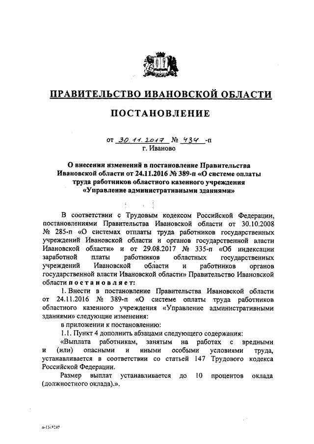 Постановление Правительства Ивановской области от 30.11.2017 N 434-п "О внесении изменений в постановление Правительства Ивановской области от 24.11.2016 N 389-п "О системе оплаты труда работников областного казенного учреждения "Управление административными зданиями"