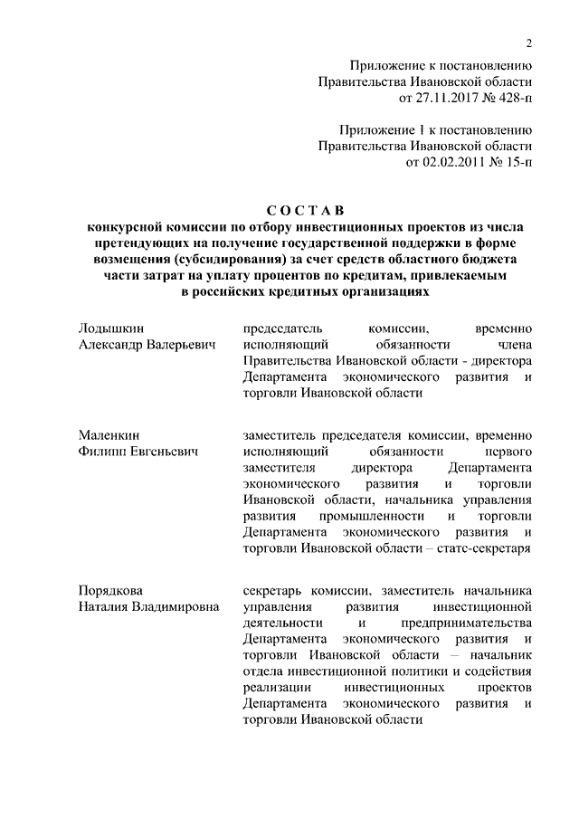 Постановление Правительства Ивановской области от 27.11.2017 N 428-п "О внесении изменения в постановление Правительства Ивановской области от 02.02.2011 N 15-п "О создании конкурсной комиссии по отбору инвестиционных проектов из числа претендующих на получение государственной поддержки в форме возмещения (субсидирования) за счет средств областного бюджета части затрат на уплату процентов по кредитам, привлекаемым в российских кредитных организациях"