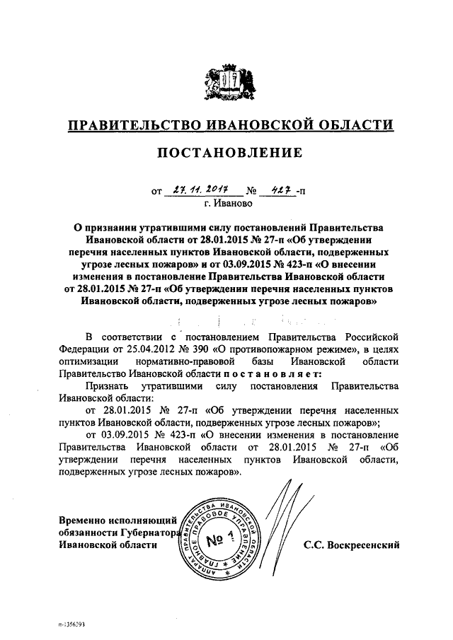 Постановление Правительства Ивановской области от 27.11.2017 N 427-п "О признании утратившими силу постановлений Правительства Ивановской области от 28.01.2015 N 27-п "Об утверждении перечня населенных пунктов Ивановской области, подверженных угрозе лесных пожаров" и от 03.09.2015 N 423-п "О внесении изменения в постановление Правительства Ивановской области от 28.01.2015 N 27-п "Об утверждении перечня населенных пунктов Ивановской области, подверженных угрозе лесных пожаров"