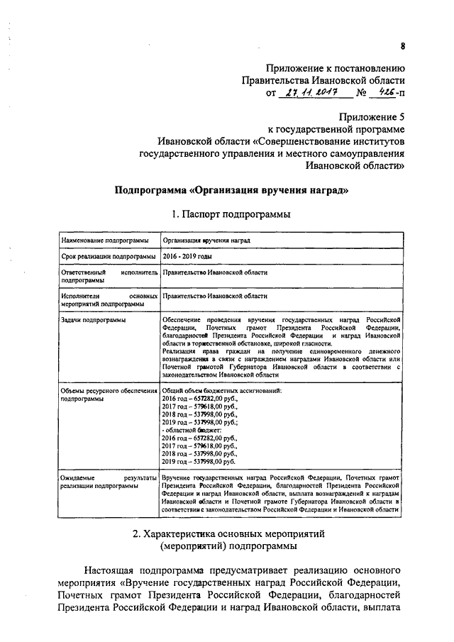 Постановление Правительства Ивановской области от 27.11.2017 N 426-п "О внесении изменений в постановление Правительства Ивановской области от 13.11.2013 N 454-п "Об утверждении государственной программы Ивановской области "Совершенствование институтов государственного управления и местного самоуправления Ивановской области" (вместе с "Подпрограммой "Организация вручения наград")