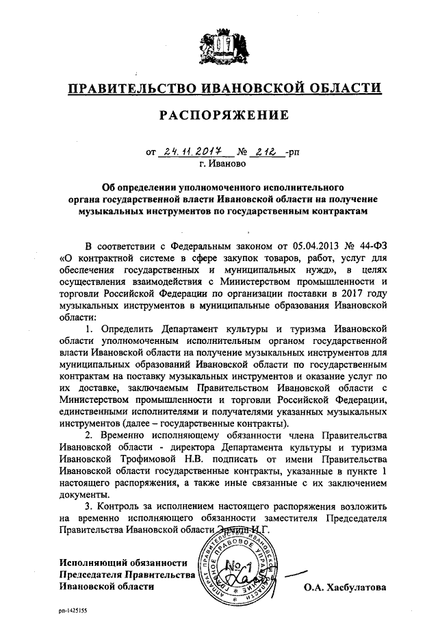 Распоряжение Правительства Ивановской области от 24.11.2017 N 212-рп "Об определении уполномоченного исполнительного органа государственной власти Ивановской области на получение музыкальных инструментов по государственным контрактам"