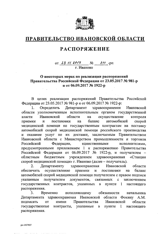Распоряжение Правительства Ивановской области от 23.11.2017 N 211-рп "О некоторых мерах по реализации распоряжений Правительства Российской Федерации от 23.05.2017 N 981-р и от 06.09.2017 N 1922-р"